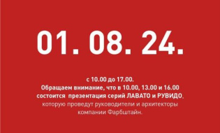 1 августа с 10.00 до 17.00 ждем вас в нашем новом офисе в г.Тольятти (п.Приморский, Строителей, 2Б). Вас будет ждать презентация уникальных серий с фактурной поверхностью ЛАВАТО и РУВИДО, которую проведут руководители и архитекторы компании ФАРБШТАЙН.